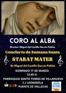 Entre otras piezas religiosas propias de la Semana Santa, el Coro hará el restreno de la obra «Stabat Mater», que ha compuesto nuestro director, Miguel del Castillo, especialmente dedicada al Coro Al Alba,