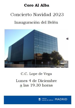 El próximo lunes 4 de diciembre, a las 19:30 horas, el Coro Al Alba participará en el Acto de Inauguración del Belén en el C.C. Lope de Vega, C/ Concejo de Teverga 1, y a continuación dará su Concierto de Navidad en el Salón de Actos de dicho centro.